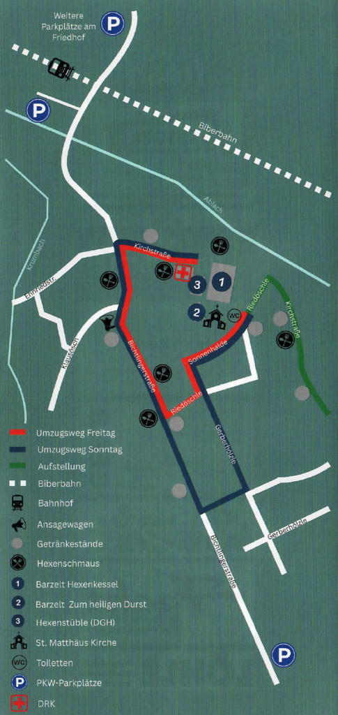- In den Zelten ist die Zahlung nur per Verzehrkarte möglich. Im Dorfgemeinschaftshaus (DGH), an den Getränkeständen entlang der Umzugsstrecke, beim Hexenschmaus sowie an den Imbisswägen kann sowohl bar als auch mit der Verzehrkarte bezahlt werden.