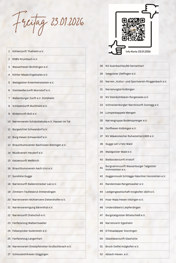 - Wir gehen in jedem Falle davon aus, dass jede Zunft/Verein/Gruppe usw. schon im eigenen Interesse mindestens zwei Personen (1x am Anfang und 1x am Ende der Gruppe) zur Beaufsichtigung der eigenen Laufgruppen des Umzuges abstellt.